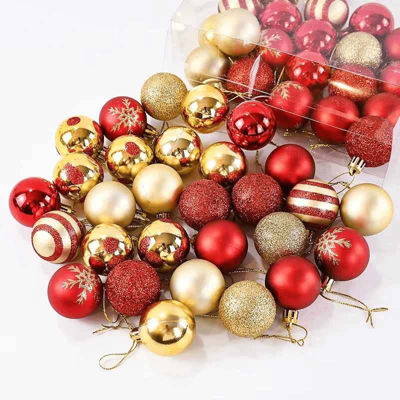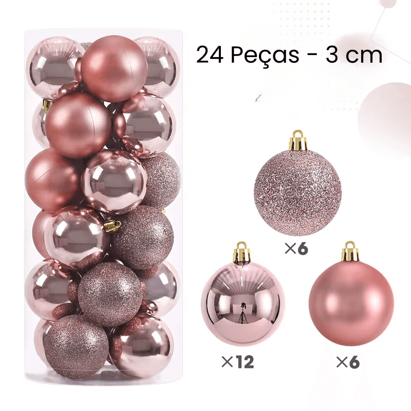 50 ou 24 (Depende o kit que pedir) Bolas de Natal: A quantidade total de bolas, misturando os diferentes acabamentos (brilhante, fosco, glitter, etc.) e as cores selecionadas (Vermelho e Dourado).