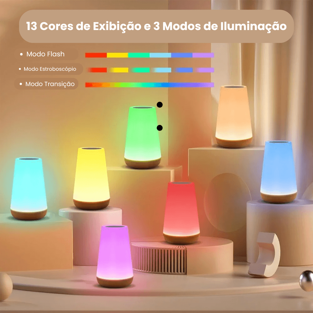 Abajur Luminária LED RGB (1 unidade): A unidade principal com a bateria recarregável interna, a fonte de luz LED e o painel de toque (touch).
