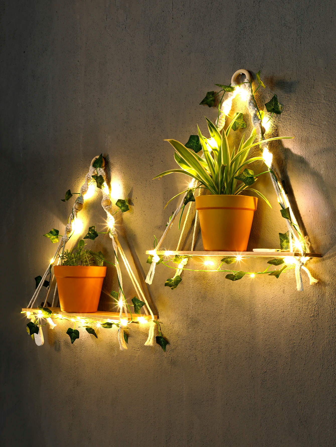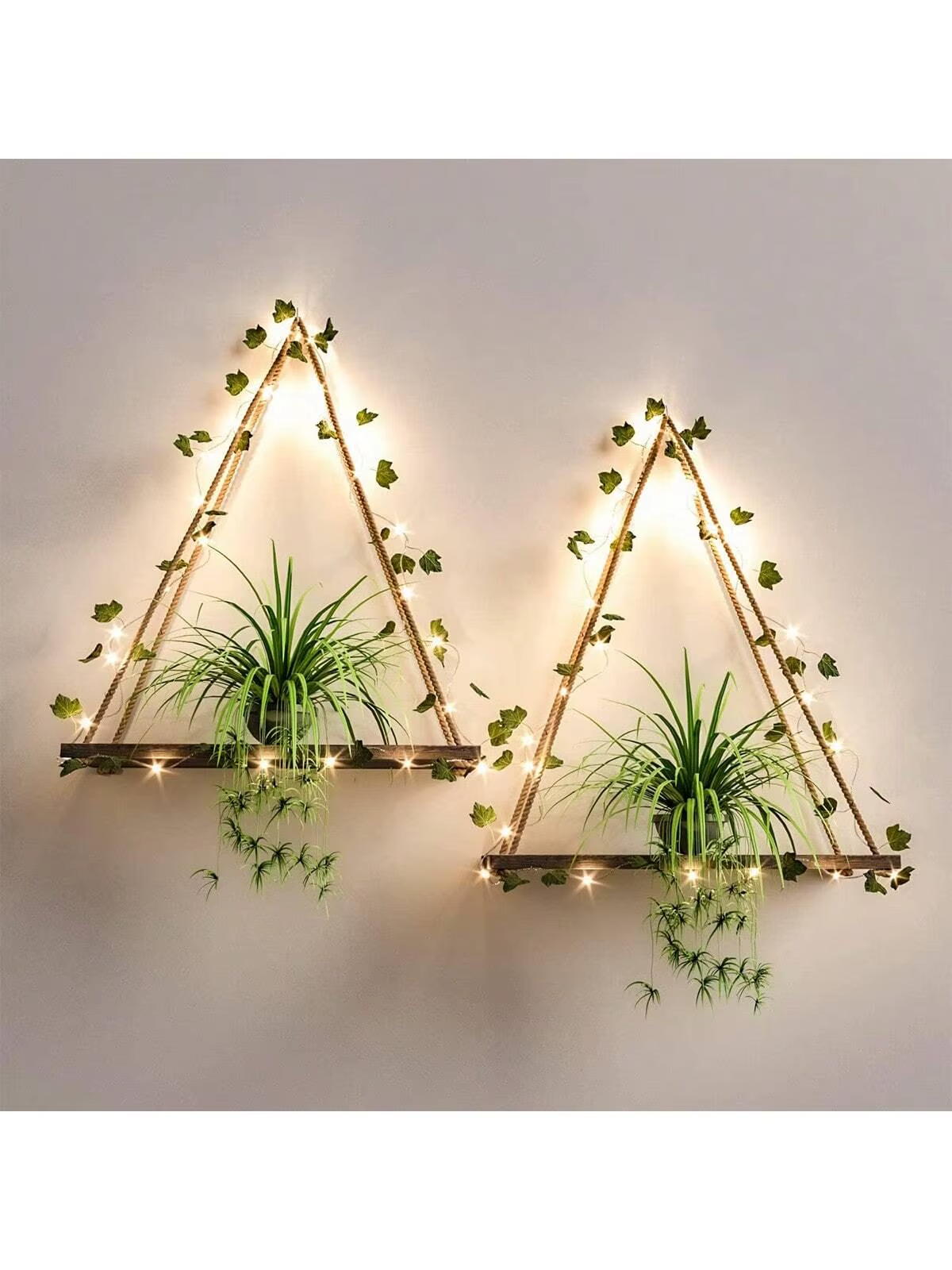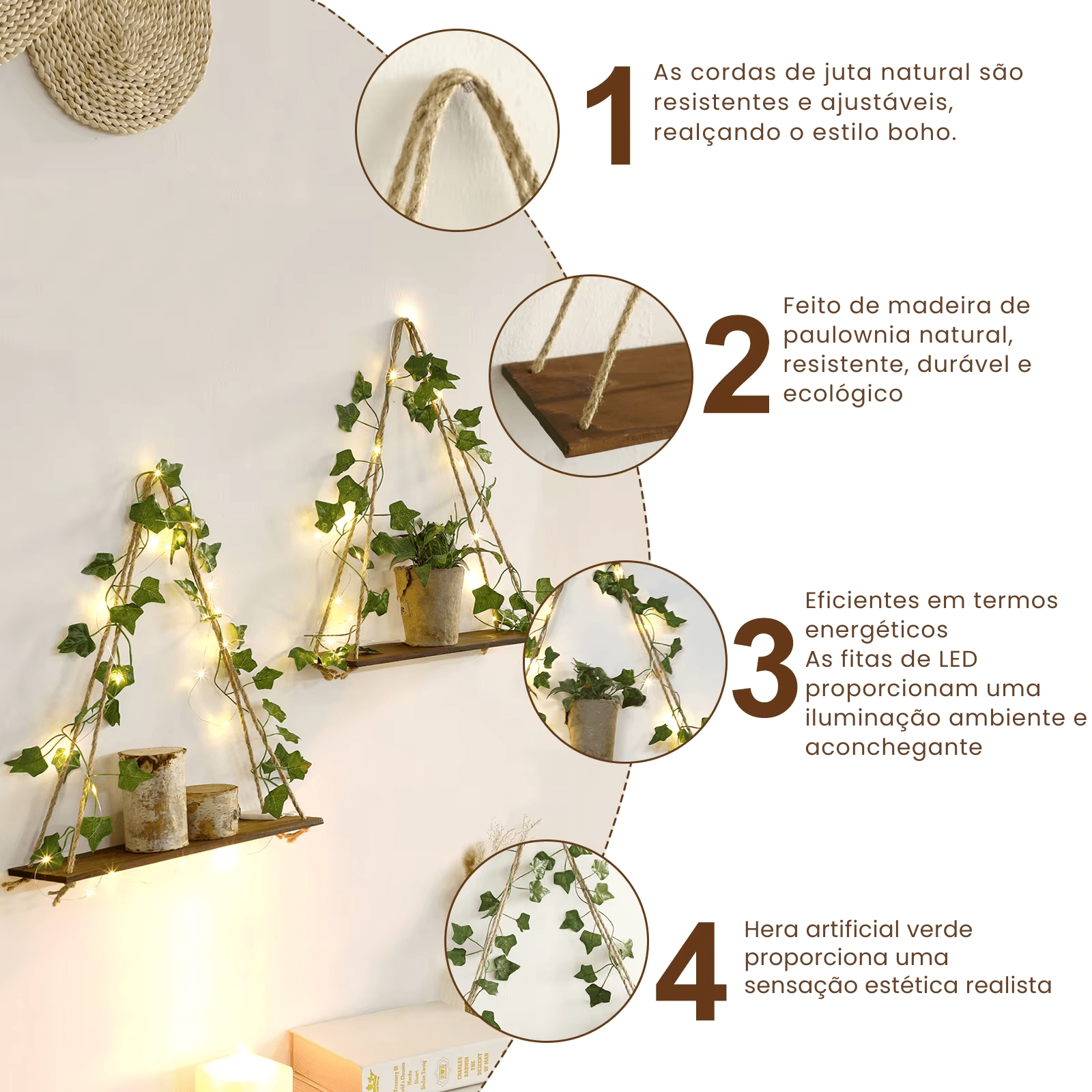 Crie um ambiente acolhedor, romântico e com a tendência boho chic na sua casa com a nossa Prateleira Suspensa Decorativa com Folhagem e LED. Este conjunto transforma qualquer parede monótona em um ponto focal encantador, ideal para quartos, salas ou escritórios que buscam uma estética suave e natural.